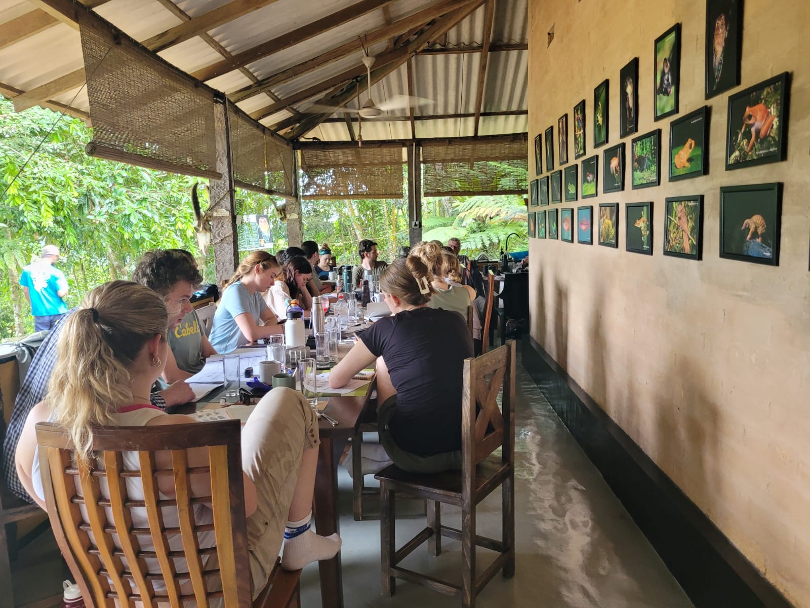 During our bus ride, many of us enjoyed the scenery outside. We saw the landscape change from urban to smaller communities to all rain forests. There were tea rubber and rice plantations at various different points throughout the ride, which we thought was very cool! Alex Brandt was lucky enough to see a male peacock showing his full, beautiful feathery display. Unfortunately, tight turns and ups and downs in the more remote areas near the end of the ride got some of us a little car sick. With a gravol and Pepto-Bismol, we eventually recovered and safely arrived at our site, the Runakanda Rain Forest Conservation Reserve in the Sinharaja rainforest! Upon arrival, we were stunned at the beauty of this site. Not only was the vegetation lush, but the lodge and sleeping accommodations were rustic and cozy, and a long, steep stone pathway lead us up towards the buildings. We realized during this climb that most of us would not have access to AC in our bedrooms, but only a select lucky few would have the luxury. So silly! The bedrooms don’t have full walls, meaning we get to experience the calming rainforest sounds and breeze as we sleep comfortably. The walls of the lodge are covered with images of the flora and fauna found in the surrounded rainforest. Building our excitement for the coming hikes and snorkeling trip.
