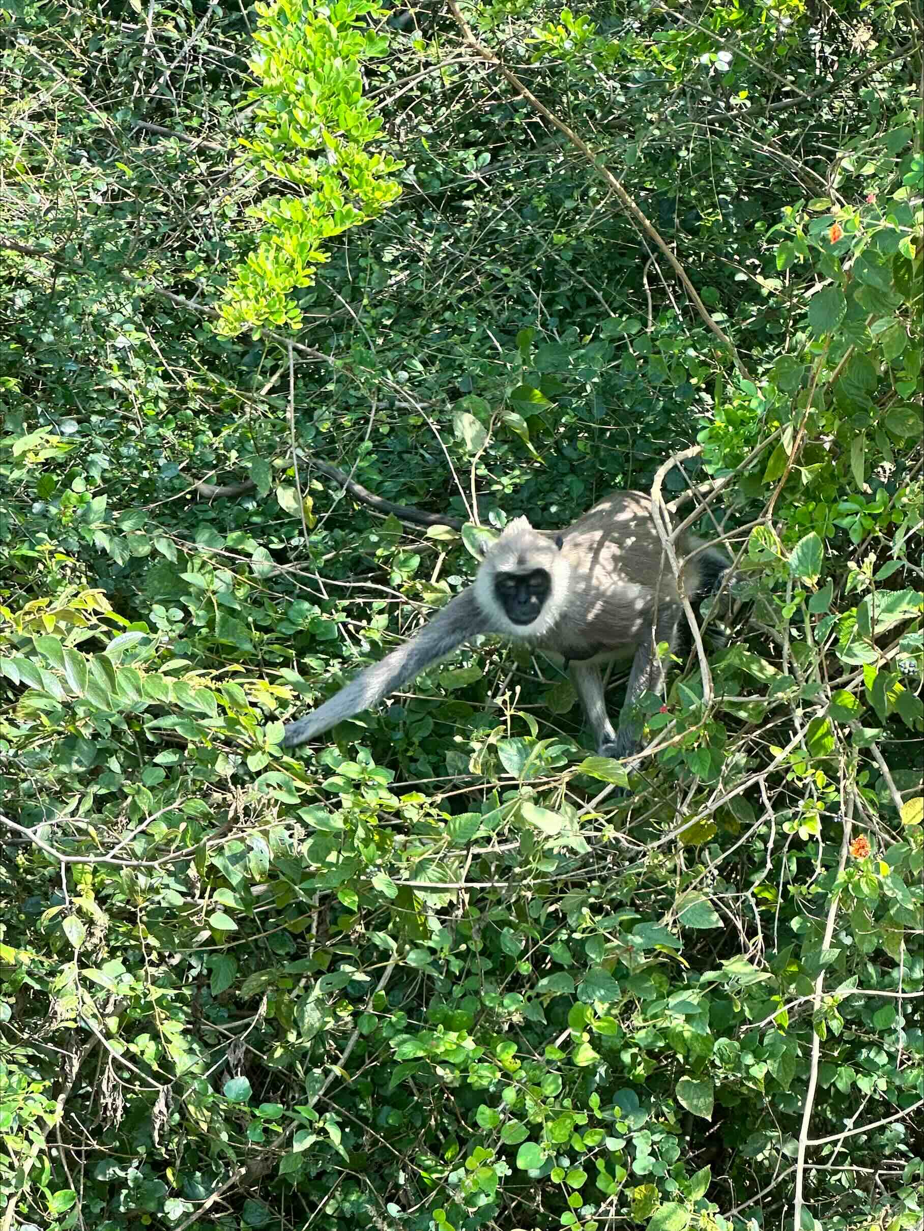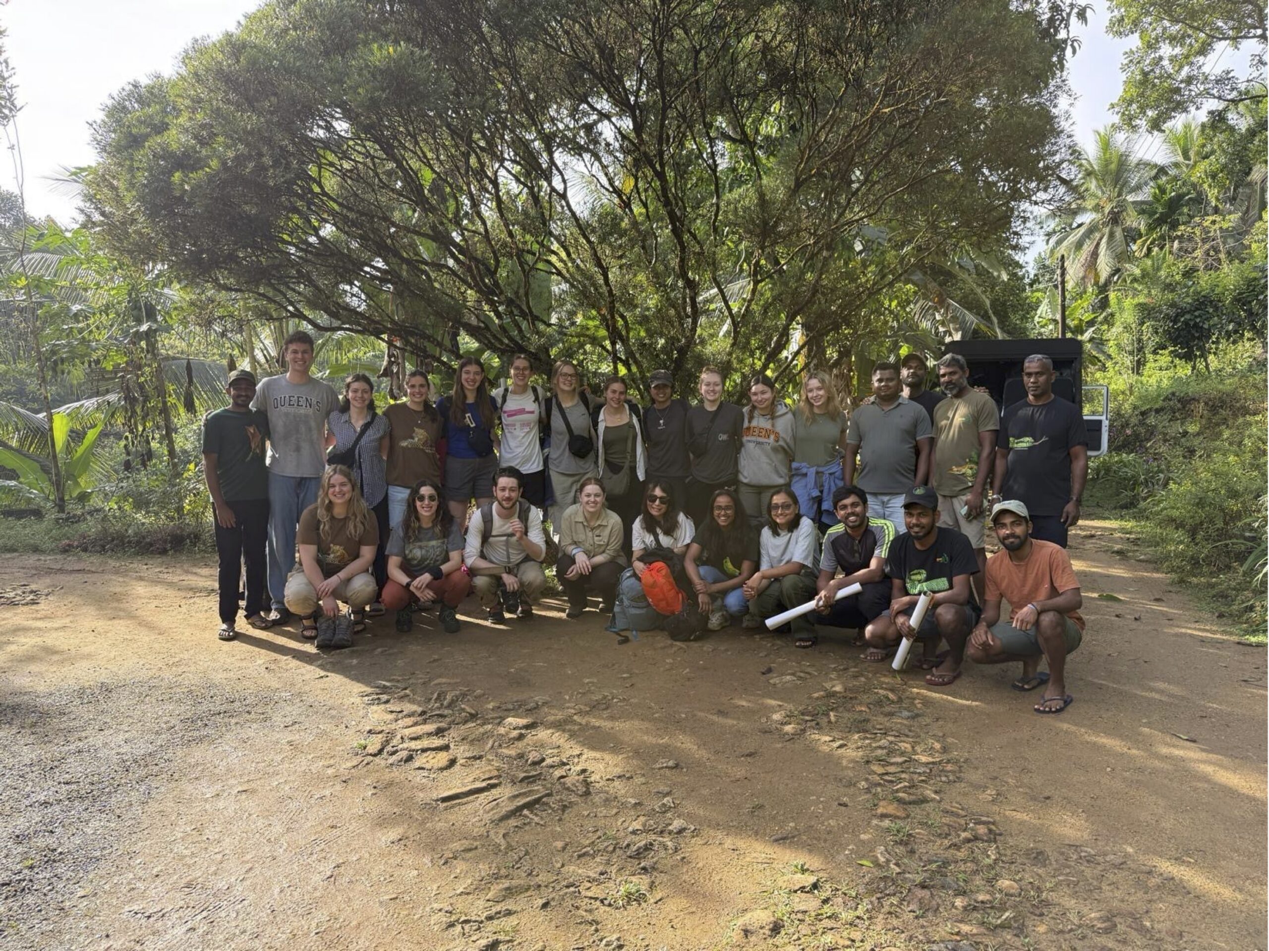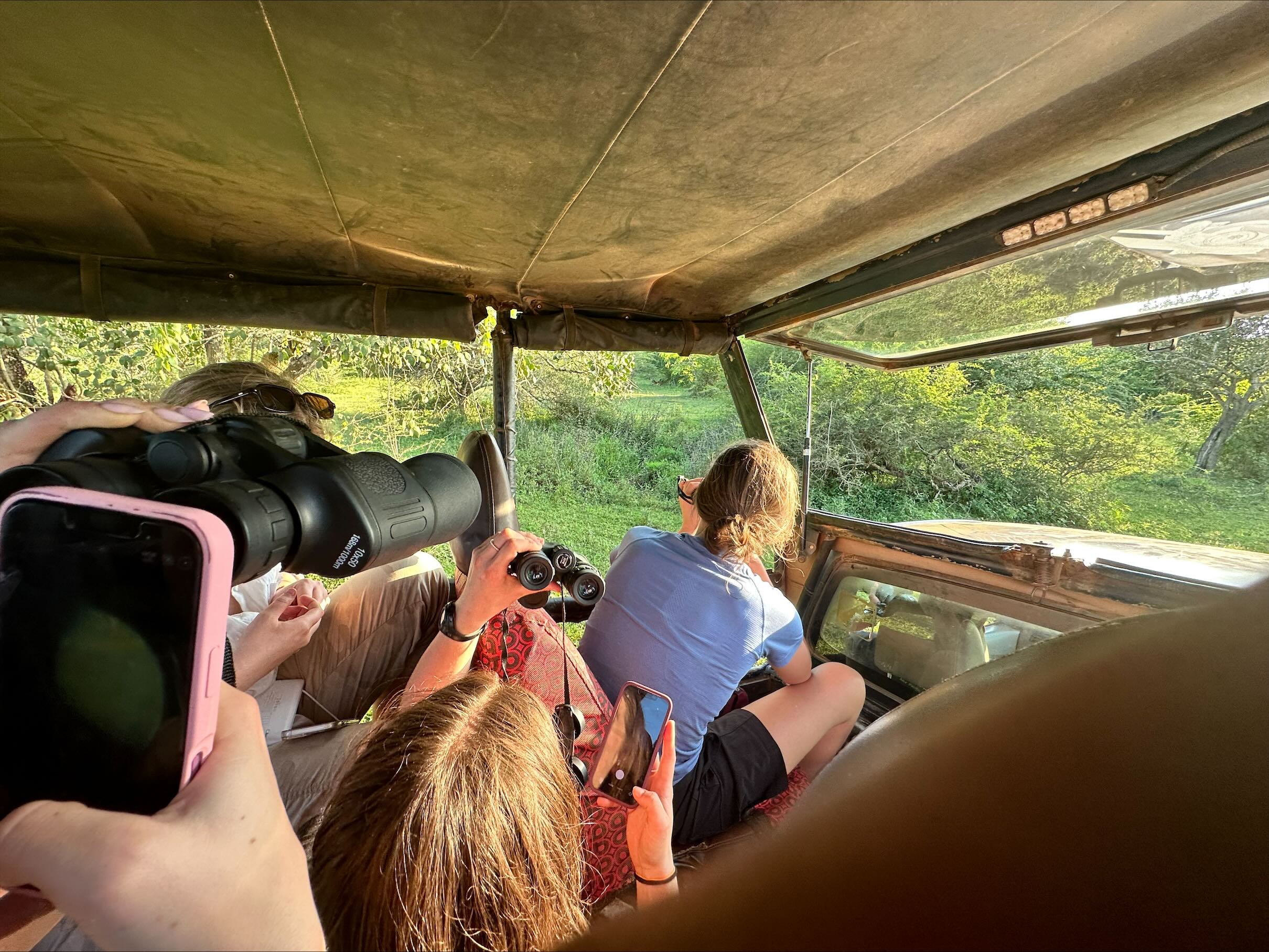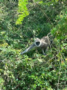 Started the day off with an early morning, leaving the Sunflower Hotel at around 5:30am. In three separate jeep-style vehicles we made our way to Yala National Park for a 6:30am safari starting at Katagamuwa gate. Along the extremely bumpy paths, our guides helped to point out many amazing wildlife, giving many of us our first look at many species in the wild (“lifers”). All groups got to see our first peeks at Sri Lankan Leopards Jerry and Lucas, who were asleep up trees by mid-morning. The first few Sri Lankan Elephants, the largest of the Asian Elephants, were spotted relatively early in the morning starting around 8:15am as well. These amazing animals were followed by a Sri Lankan Sloth Bear a rarer sighting, that crossed the road between a few of the vehicles, giving many of us an up-close view of the small bear. Between encounters of the “big three”, as many called the leopards, elephants, and sloth bears, we stopped for three species of brightly coloured bee-eaters (birds) positioned close and far from the vans, Water Buffalo and crocodiles wallowing in the muddy water, and Bengal Monitor lizards trying to catch as many rays as possible in the early morning sun. Peafowl were also a common sighting as we drove along enjoying the scenery, which included a large rock in the middle of the landscape aptly named Elephant Rock for its likeness to the creatures.  Throughout we caught glimpses of the many Spotted deer, Sambar deer, and Tufted Gray Monkeys (one eating from a bush) that also inhabit the park.