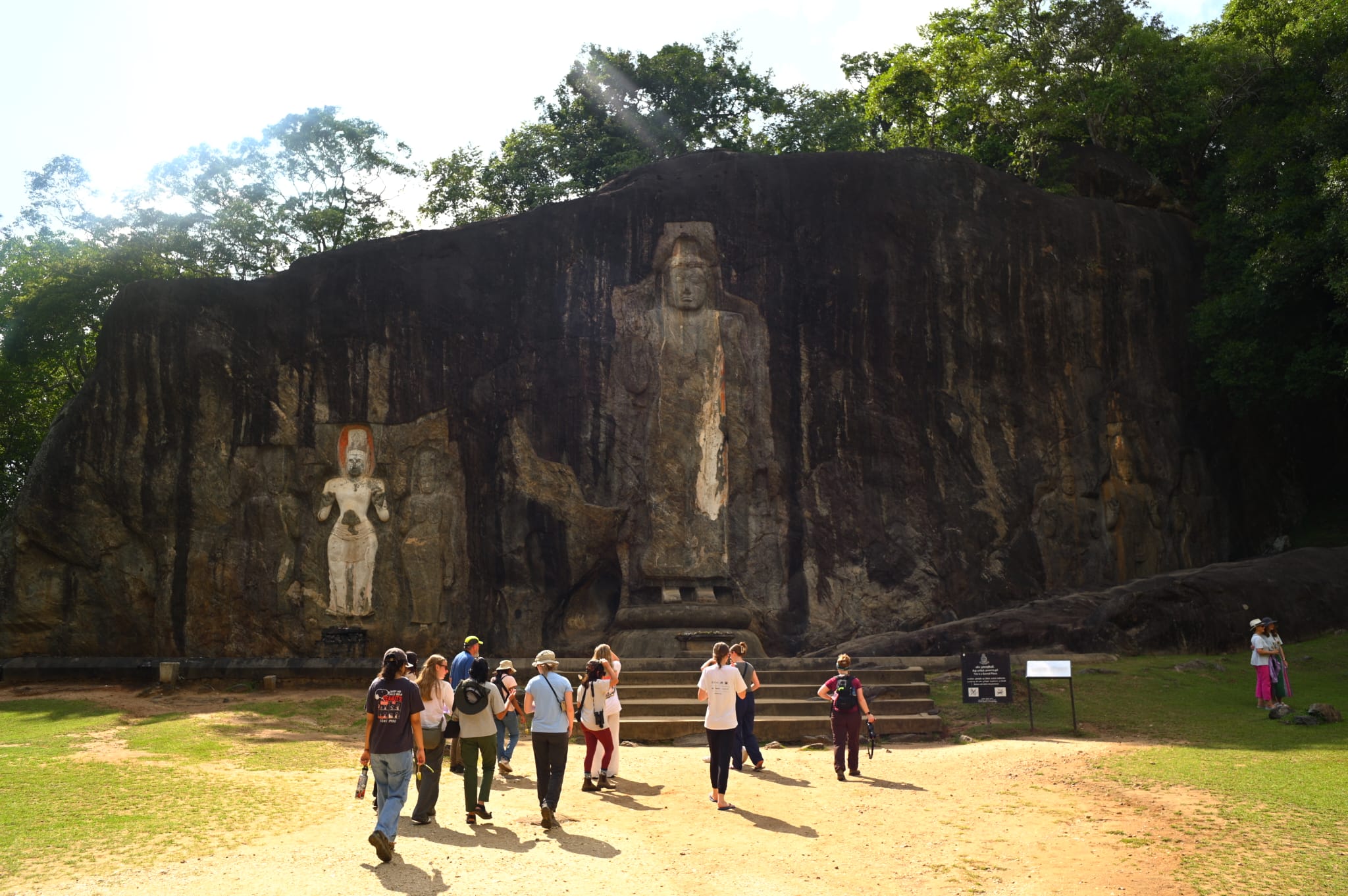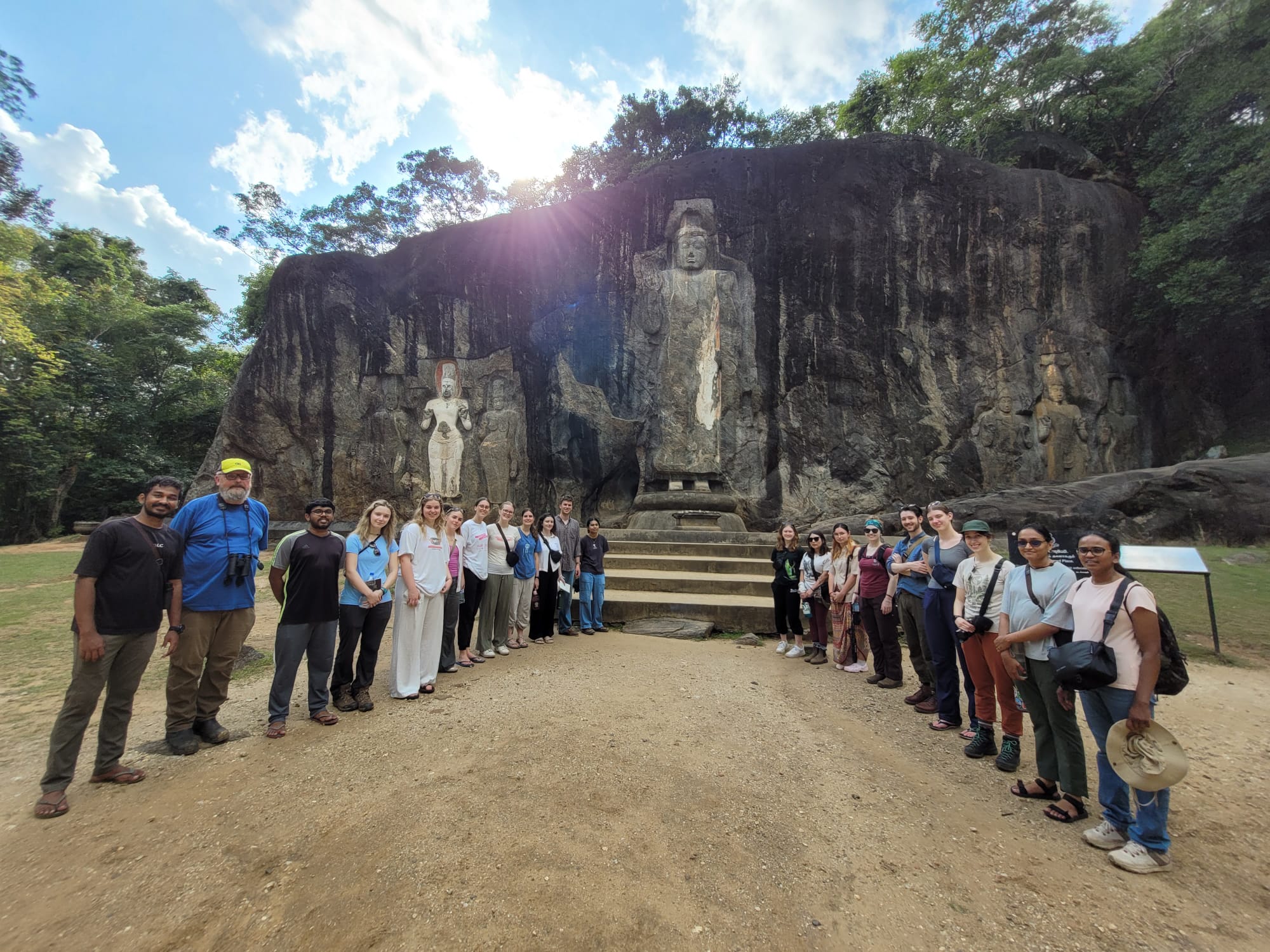 Our next stop was at the Buduruwagala Ancient archeological site carved in the 9th century. Before entering the site, we were given lotus flowers which in Buddhist culture serves as a reminder of the impermanence of all things. This site features the two branches of Buddhism: Theravada and Mahayana. The class was given a quick tour by the site guide. He shared with us that his family has being guiding in this spot for three generations. Buduruwagala means: Buddha images carved on stone. The carvings featured 7 Buddhas total, 3 on each side and the largest in the middle. He also showed us many images you could find created by the natural features of the rock such as a lion, the face of a women, and the rock its self is even in the shape of an elephant. Remnants of the white plaster and orange paint used to cover the granite remains. When we approached the buddha statue for the first time, we spread the petals of our lotus flowers and with a bow placed the flowers at an alter as an offering. As we left the site our guide showed us footprints left in the ground from a local elephant who roams the site. We ran into land and water monitors and took some time to observe and photograph Alexandrian Parakeets and an Indian Coocoos. Before hopping back on the bus some of us grabbed a refreshing soda or mango juice from the nearby restaurant.