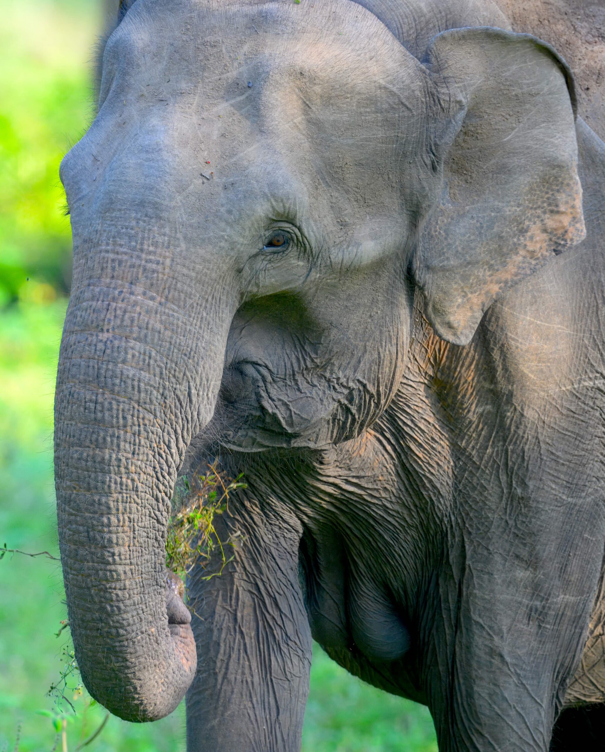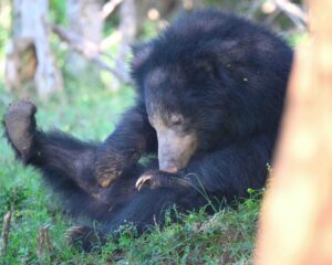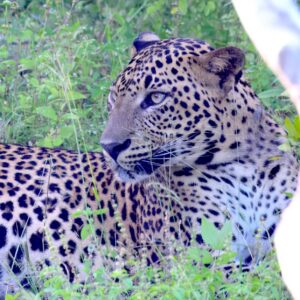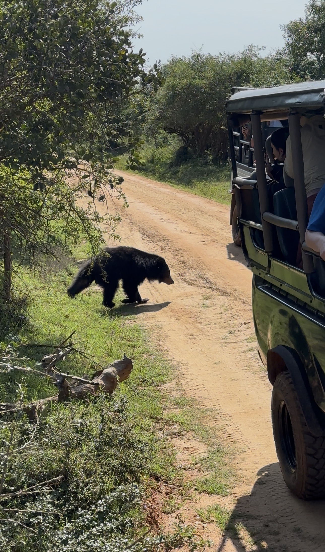 On our way out of the rest-stop, one of the guides spotted a large Brown Fish Owl, perched in the shade in a tree. We photographed it as it looked around lazily, seeming to judge our very existence. As one of the vehicles passed another large, but this time, very flat rock, and one of the guides informed the group that this rock was used for drying meat before the park was protected. In the last few hours, we managed another sighting of a sloth bear rubbing up against a tree, and then wandering into the trees, which caused some displeasure among some foreign guests in the jeeps behind us who didn’t get as clear of a sighting. We were able to see a pair of female elephants leading a baby elephant along the road, where one of three safari vehicles from our group experienced another up-close encounter before the elephants slipped into the trees. Our guides then tracked where the elephants were likely to go based on their path, and demonstrating their amazing understanding of the park, were correct. One elephant crossed the wetland through the water, while the other female went around with the baby, as it was too small to walk through the water. One guide gave the group even more detail, one of the females was the baby’s mother, while the other was a caretaker, which allows the mother to get enough food to feed the calf as it’s required 15 L of milk per day. Sri Lankan Elephant calves are born at 150-200 kg, so the amount of milk a baby would require is quite a bit more than your average human baby. After this final elephant sighting, we began our trek out of the park, only for our guides to get the call that one of the female leopards was awake and on the move a little way away. Our drivers got us there as hastily as possible where we luckily ended up at a prime location to watch “Lucas’ wife”, sitting on a bank and then saunter to a bush to lay back down. We sat there for quite a while, simply watching the majestic cat.