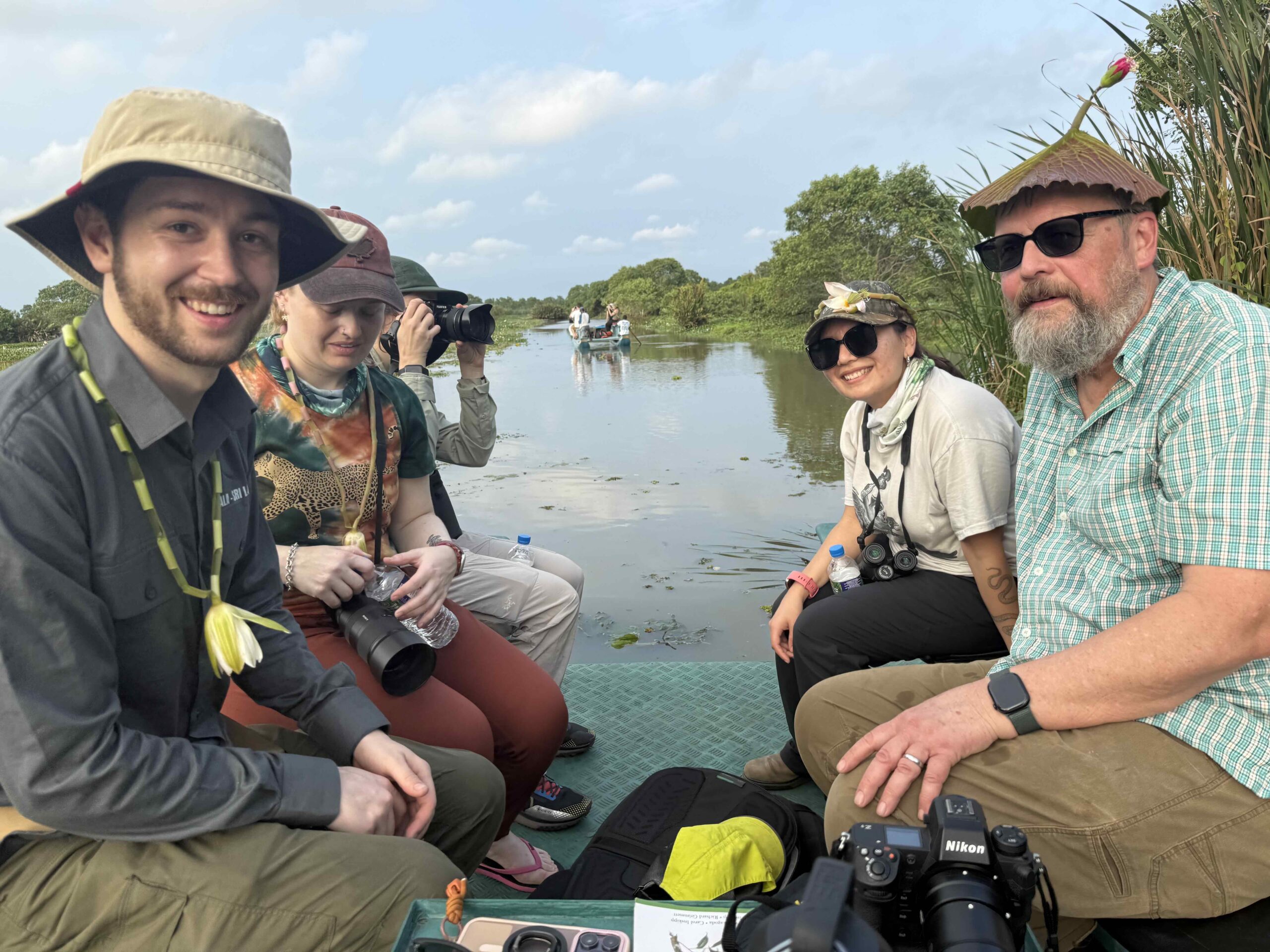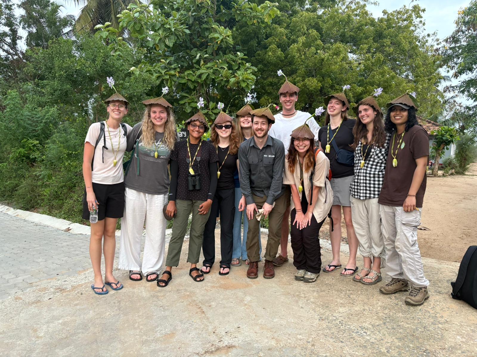 We departed and by 4:00 PM had arrived at the Kalametiya bird sanctuary specializing in bird watching and ecotourism. We went out on lagoon boats through the mangroves guided by Priyanka, Kumare, Pasindu, Sanka, Sameera, Chamie, and Mahinda. We climbed up on the rocks and it was a spectacular view. There were so many bird species and some of the most interesting were white-throated kingfishers, painted stork, red-vented bulbul, flame-backed woodpecker, and blue-faced malkoha. Our guides were so kind and made us water lily necklaces and lilli pad hats with the water Hyacinth’s at the top (except for Steve’s hat which had a mangrove blossom)! We took a break and had some bananas and Kokiss cookies.