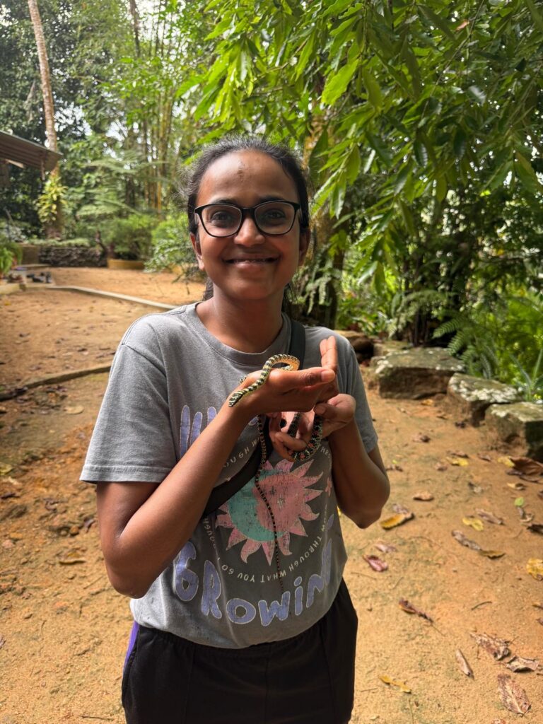 Throughout the seminars and debate, we took tea, meal, stretch, and snake breaks. During our snake breaks, we had the incredible opportunity to see and hold a golden flying snake, observe a very venomous Russell’s viper, and see another beautiful venomous creature, the Indian cobra with our own eyes and, more importantly, our camera lenses. Don’t worry parents, we didn’t hold the venomous ones!