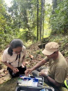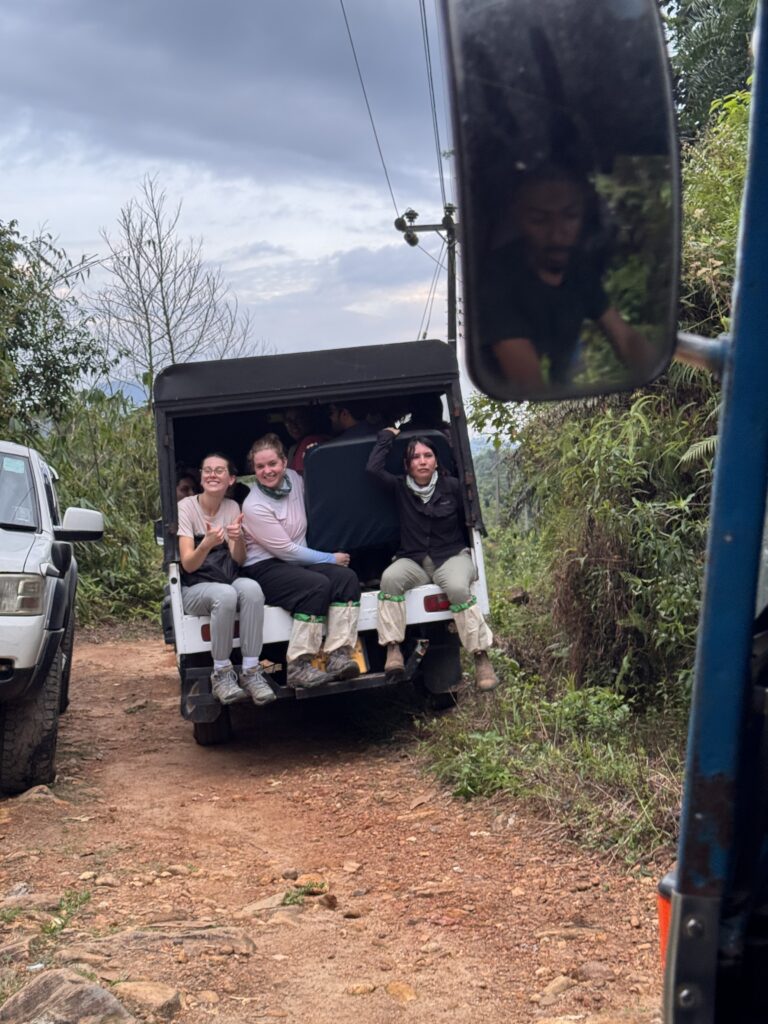 After the kind Sri Lankan staff prepared lunch that included the best eggplant that we have ever had, we set off on a hike. We hopped in a pick-up truck and tuk tuk to travel 1 km to the site. Sampath introduced the history of the vegetation located on the hill and their efforts to remediate the rain forest corridors. He showed us newly planted saplings, and discussed native and invasive species, and the conservation in progress. Most interestingly, Sampath showed us a tree species that is otherwise extinct in the wild. On-going recovery efforts of this species includes taking tissue samples cultured from an individual in the Royal Botanical Garden in Sri Lanka. We are really pleased to the devotion for conservation to promote biodiversity! We heaved and hoed up the rest of the hill, trying our best to avoid leeches while rocking our fashionable leech socks. Sampath took us to a large rock that looked out upon the rain forest, which was such a special experience. We hustled back down the hill to avoid potential rain and to run away from the leeches. We came back to the lodge for teatime served with wraps of coconut, ginger, and cinnamon. As night settled, some of us went out to catch birds, while others remained behind to catch our breaths. Sampath and friends brought back a Sri Lanka frogmouth. This elusive animal was so cool and so pretty, and to add on to the awe-inspiring catch it was a male! For his research, Sampath and his students demonstrated routine measurements, blood sampling, and handling methods. Most of us held the bird for a quick moment, and finally he was set free to enjoy his life in the wild. To end the day, we are relaxing, showering, and getting ready for tomorrow!