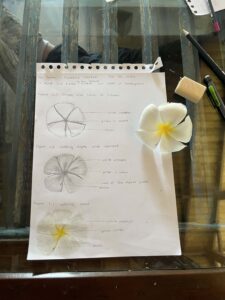 We did an art and sketching activity in the morning at 9am to practice our sketching and observational skills like many 19th century naturalists who did not have mobile phones; we also labeled our drawings.  We sketched flowers, leaves and coconuts including shape depth form and colour. Victoria selected a toad to draw.
