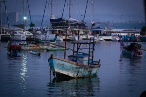 We soon pushed aside this reality to embrace the marine adventures to come. Arriving at the docks, we skirted past bikes and tuk-tuks, scrambling our way to the top deck of our boat. All around us, colourful, almost tie-dyed fishing boats in the Sri Lankan style lined the protected harbour—steep-bowed and sitting high in the water, waiting to be filled with their catch. The boats filled with tourists and, by 6:30, we were off.